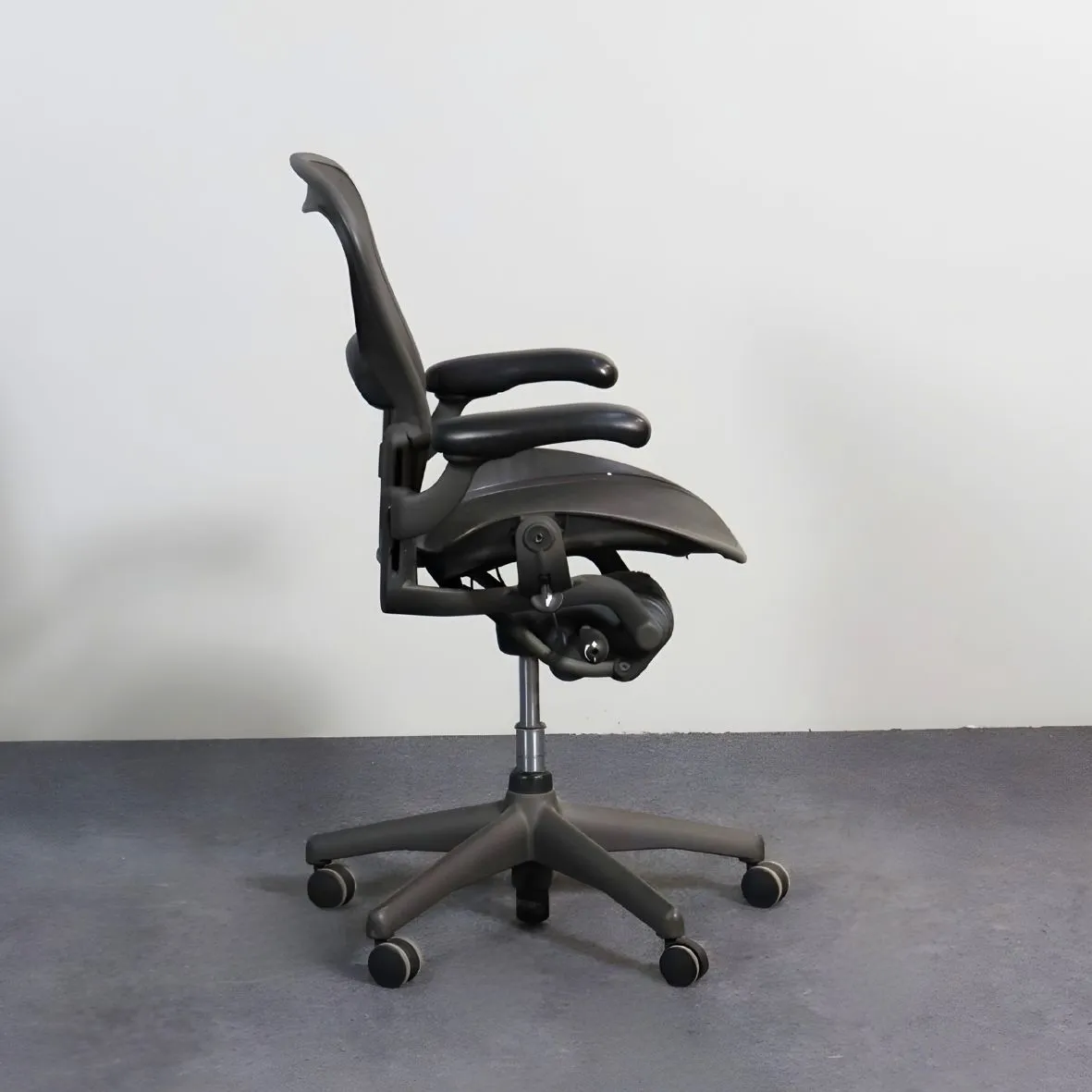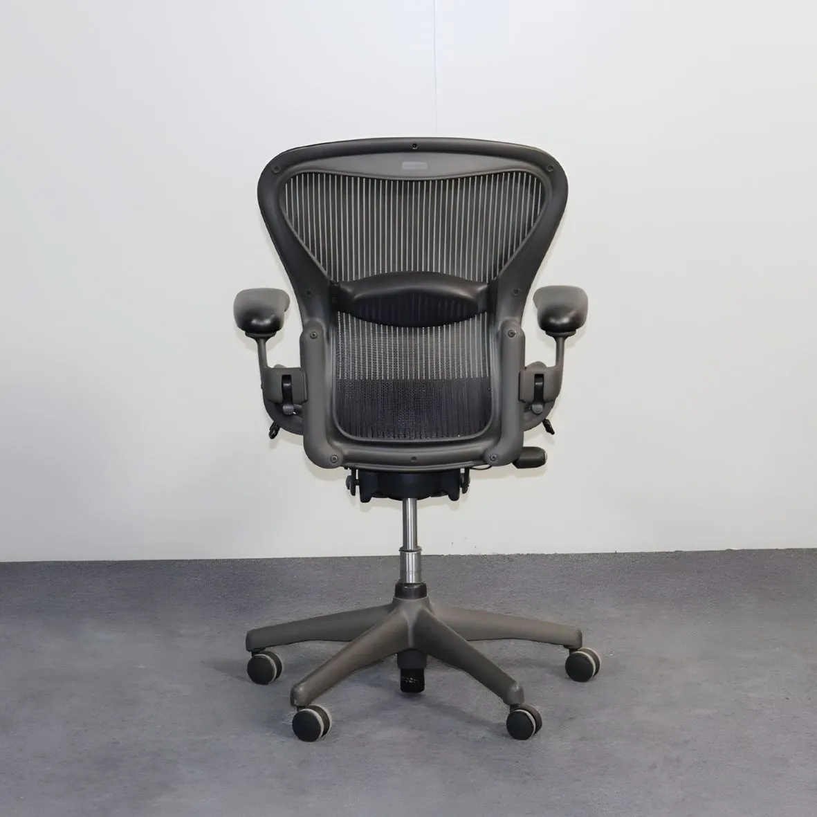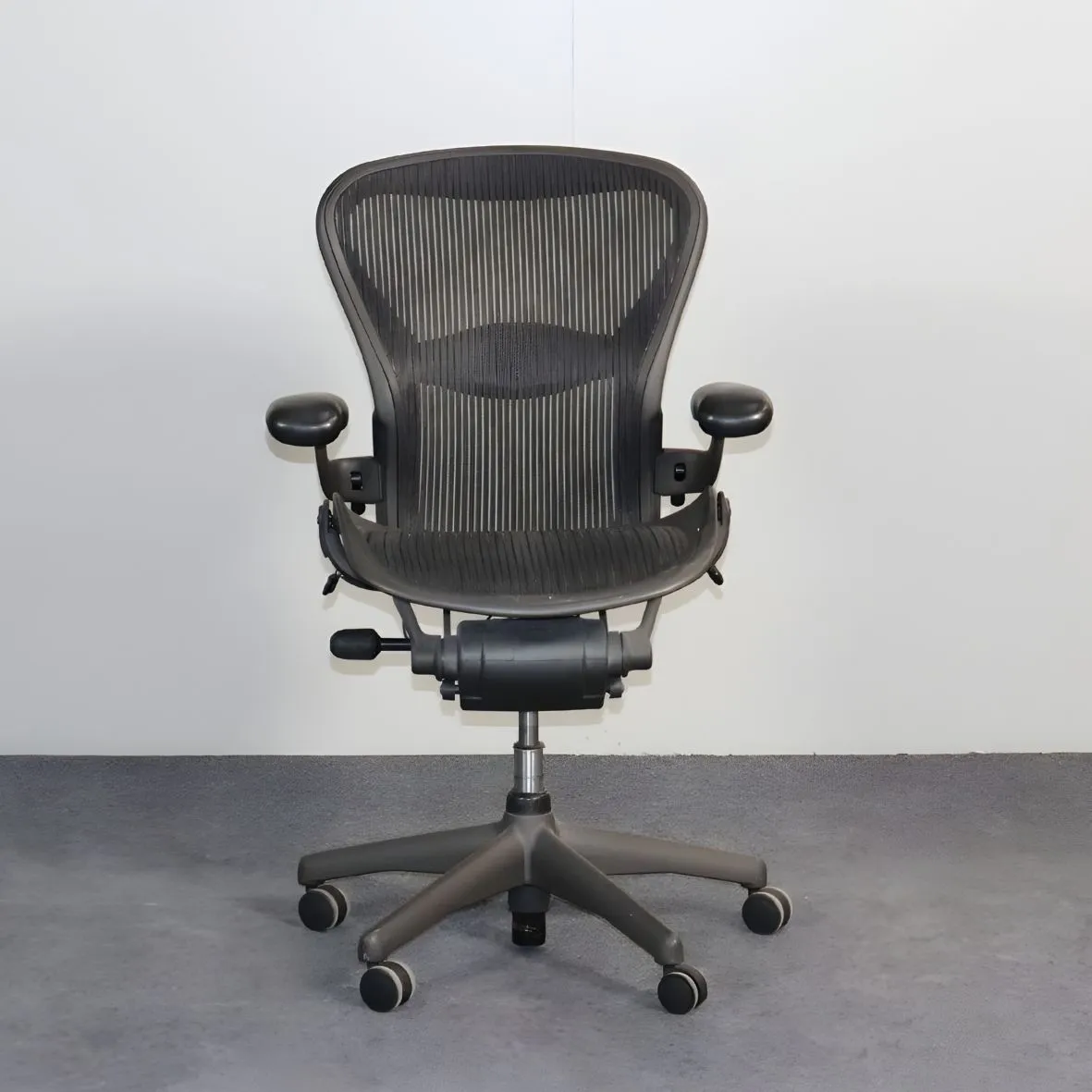 Tämä käytetty Aeron-työtuoli on siistikuntoinen, verhoiltu hengittävällä mustalla mesh-materiaalilla ja varustettu säädettävillä käsinojilla ja ristiseläntuella.