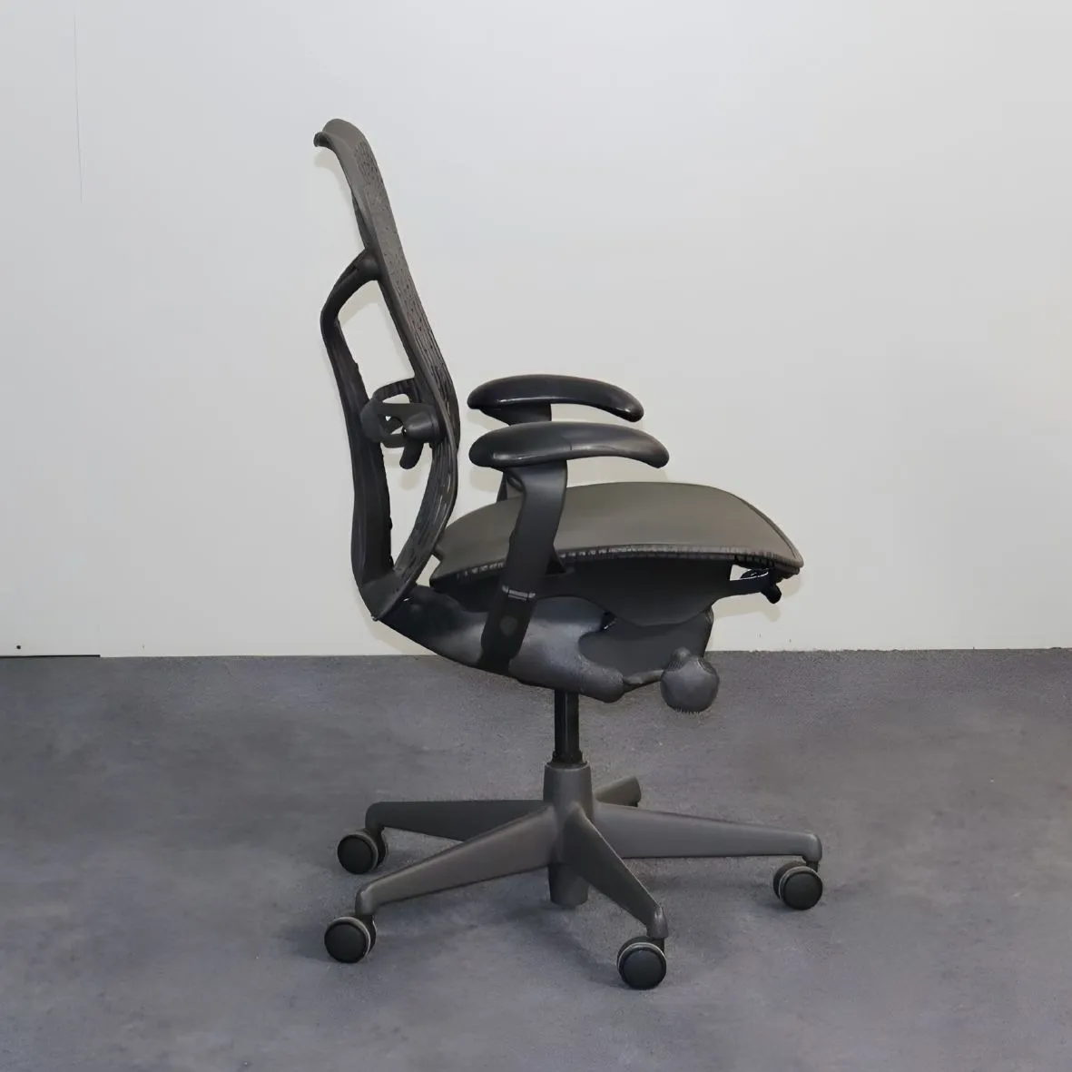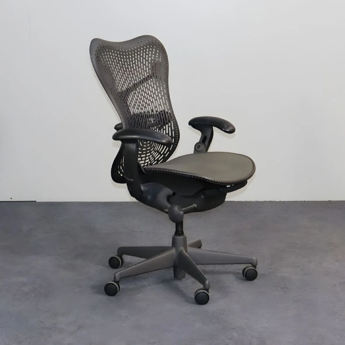 Herman Miller Mirra -työtuoli yhdistää ergonomisen suunnittelun ja hengittävän muovirungon älykkääksi työtuoliksi, joka tukee istumista koko työpäivän ajan. Tämä käytetty Herman Miller Mirra -työtuoli on hyväkuntoinen, musta, muoviselkäinen ja säädettävä.