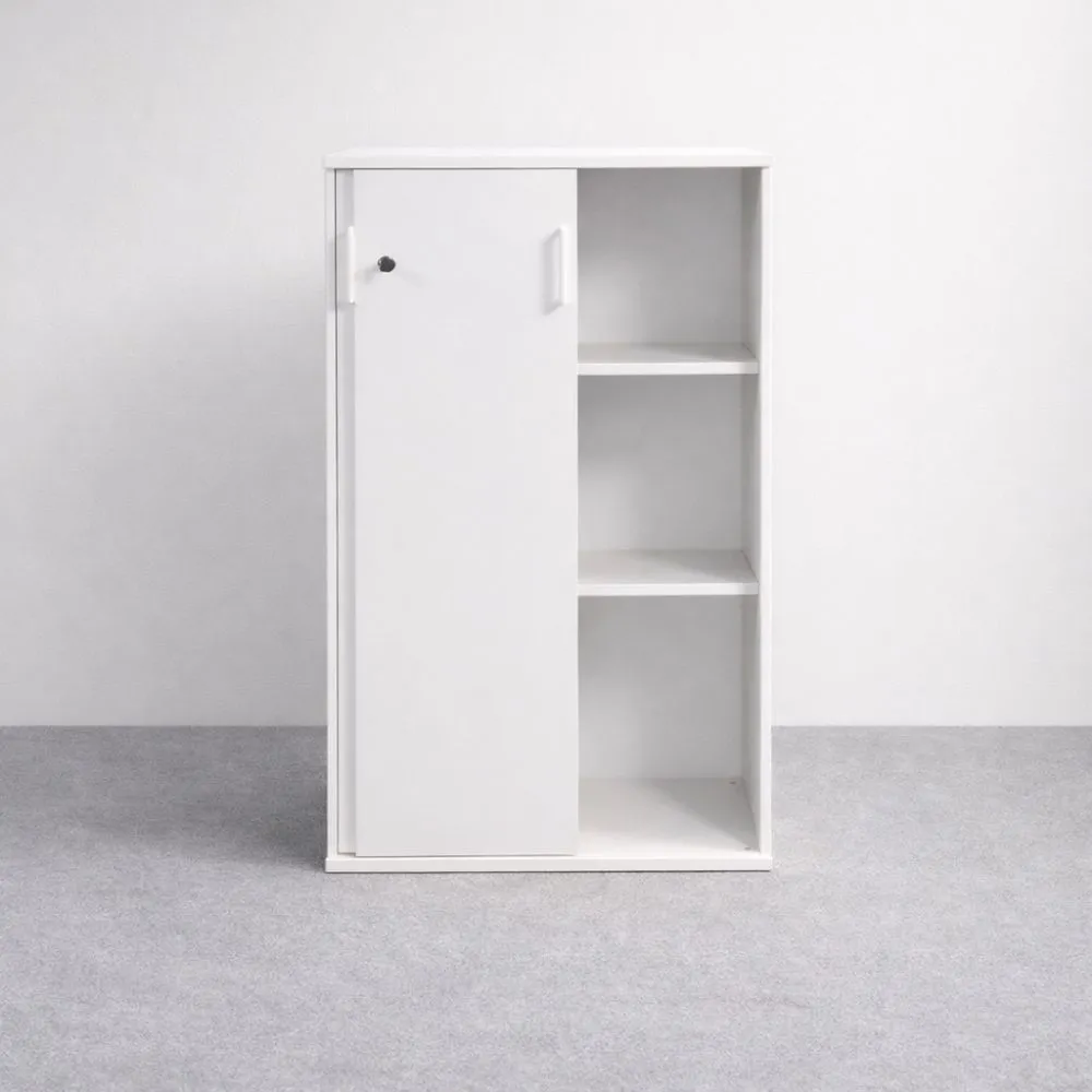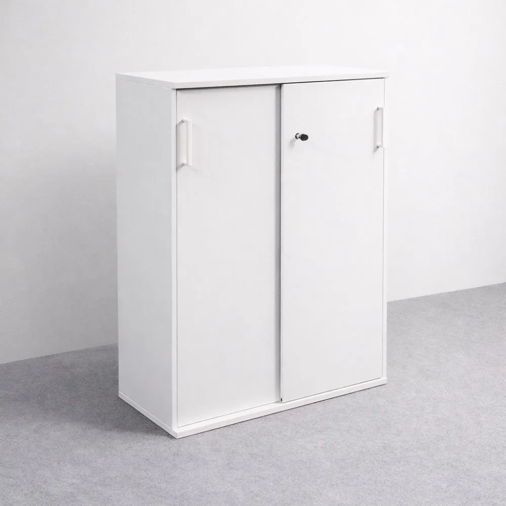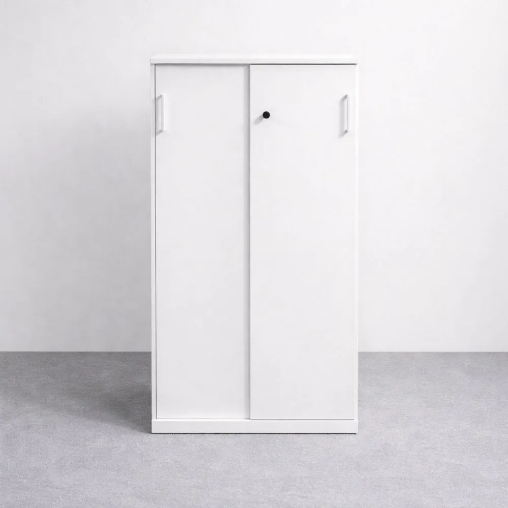 Valkoinen kaappi koossa 113,5×80×40 cm on tilava mutta selkeälinjainen säilytysratkaisu toimisto- ja työympäristöihin, joissa tarvitaan runsaasti säilytystilaa ilman korkeaa kaappia. Tämä käytetty kaappi on siistikuntoinen, valkoinen ja varustettu lukittavilla liukuovilla.