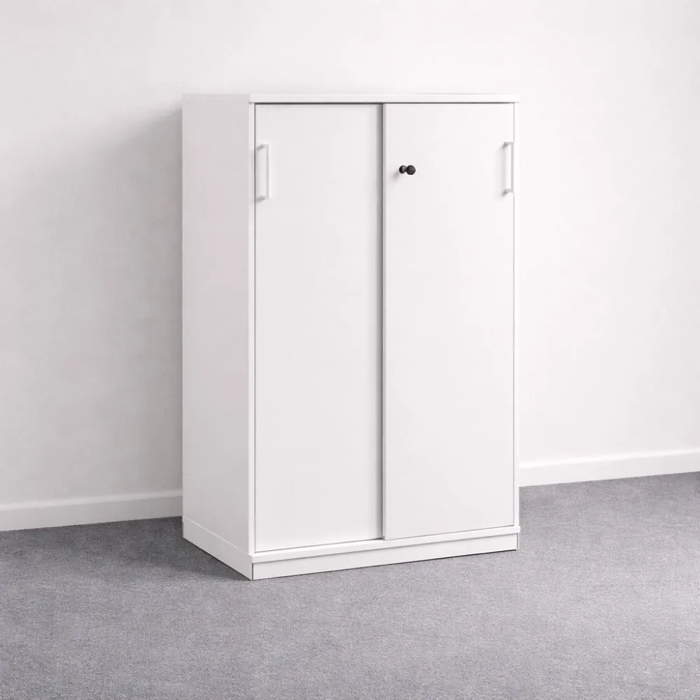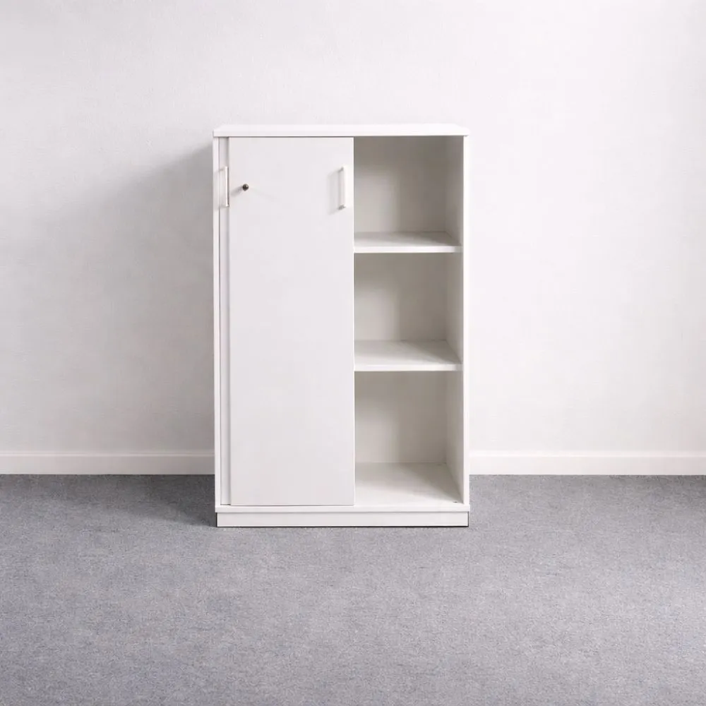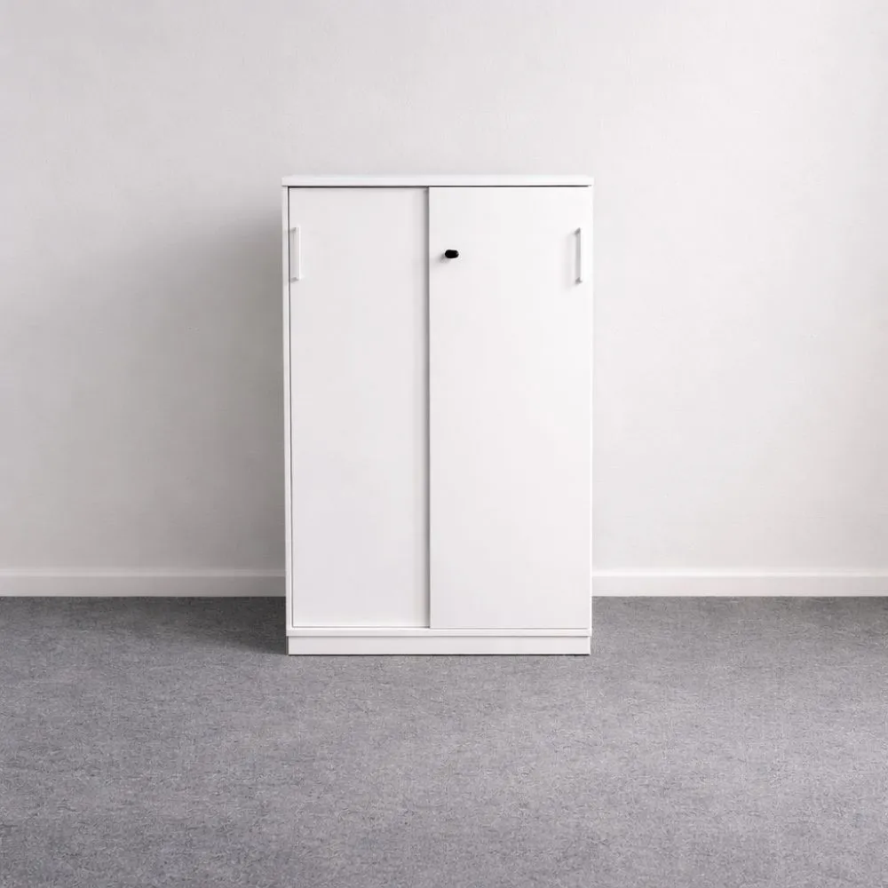 Valkoinen kaappi koossa 118×80×40 cm on tilava ja selkeä säilytysratkaisu toimisto- ja työympäristöihin, joissa tarvitaan runsaasti säilytystilaa kompaktissa muodossa. Tämä käytetty kaappi on siistikuntoinen, valkoinen ja varustettu lukittavilla liukuovilla.