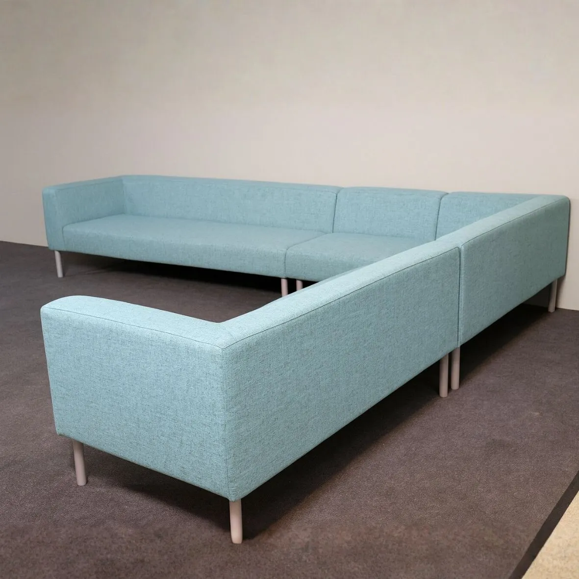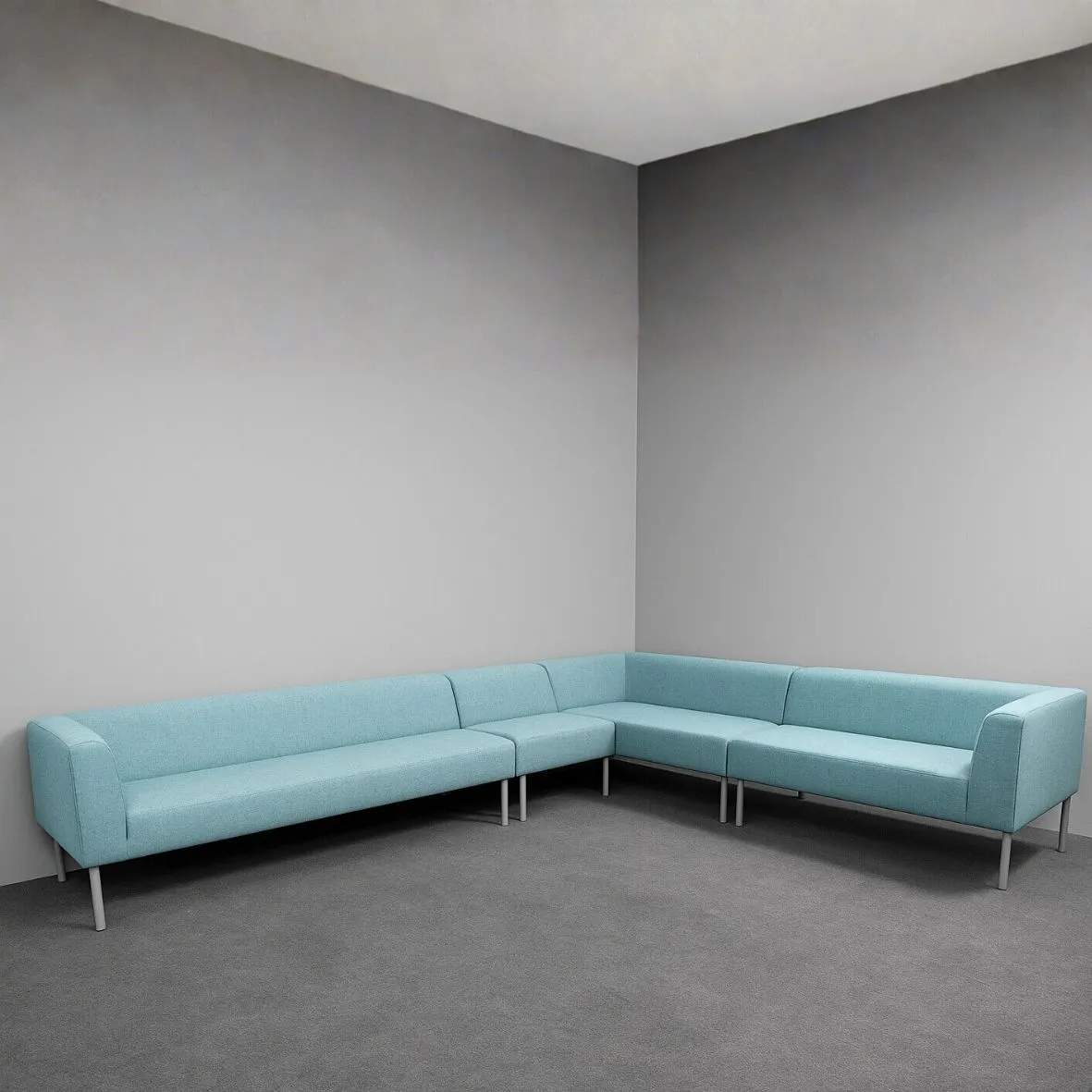 Käytetty kulmasohva tuo raikkaan värin ja kevyen ilmeen työ- ja julkisiin tiloihin. Tämä neliosainen käytetty kulmasohva raikkaassa vihertävänsinisessä sävyssä sopii erinomaisesti moderneihin toimitiloihin, joissa arvostetaan selkeää muotoilua ja värien tuomaa ilmettä. Sohva tarjoaa miellyttävän istumakokemuksen ja tukee kestävää sisustamista kiertotalouden hengessä.
