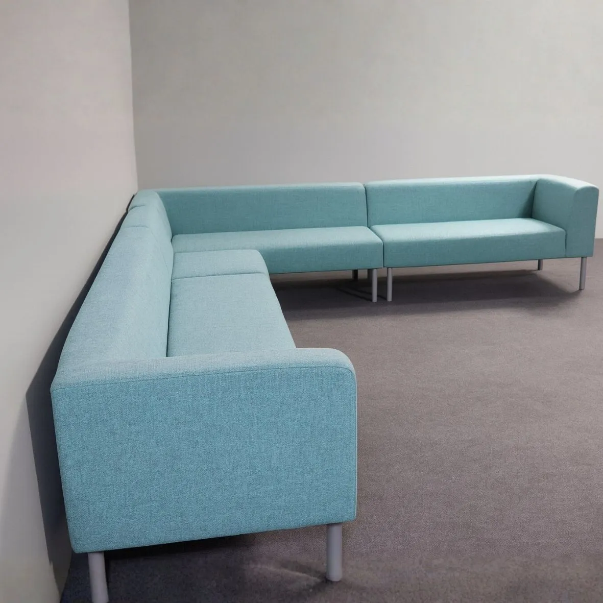 Vihertävänsininen kulmasohva tuo tilaan pirteyttä ja keventää kokonaisilmettä, säilyttäen samalla ammattimaisen ja huolitellun tyylin.