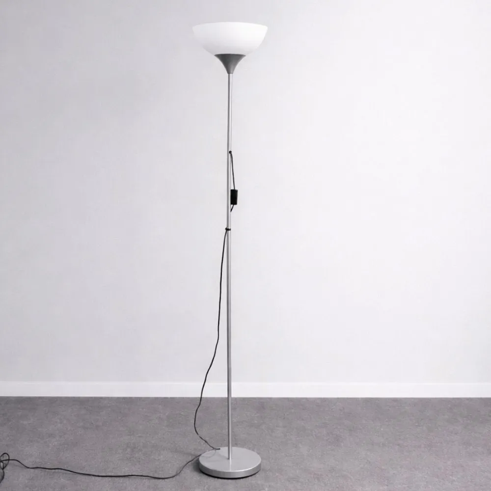 Lattiavalaisin 180 cm on ajattoman tyylikäs yleisvalaisin, joka tuo pehmeää ja tasaisesti jakautuvaa valoa tilaan ilman häikäisyä. Tämä käytetty lattiavalaisin on siistikuntoinen, valkoinen kupu ja metallinen runko.