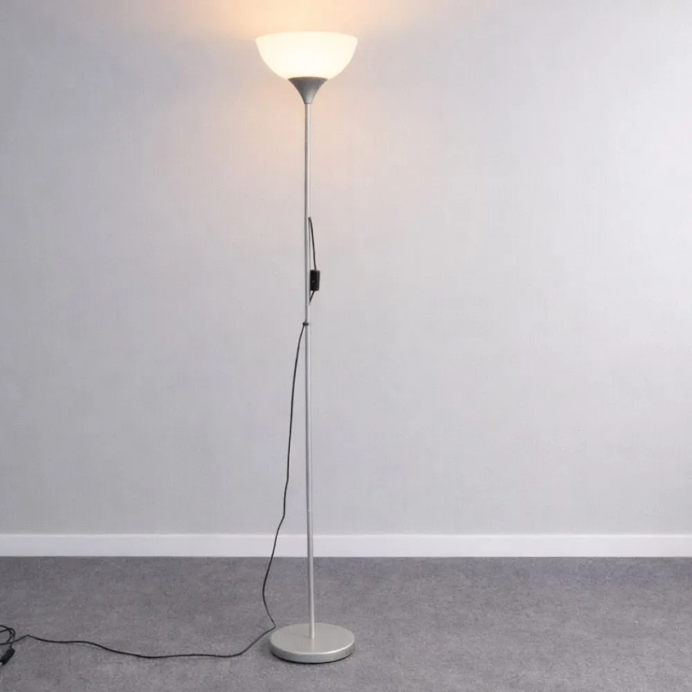 Käytetty lattiavalaisin 180 cm – tyylikäs valaisin metallijalalla ja valkoisella kuvulla
