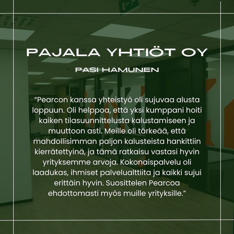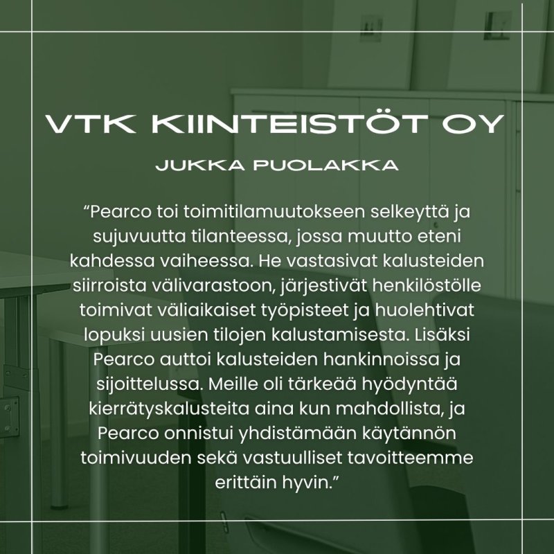Katso video, jossa Myyntipäällikkö Timo Sydänmaanlakka esittelee Pearcon palvelut toimitilamuutoksiin ja kertoo, mikä on saanut asiakkaamme erityisen tyytyväisiksi.