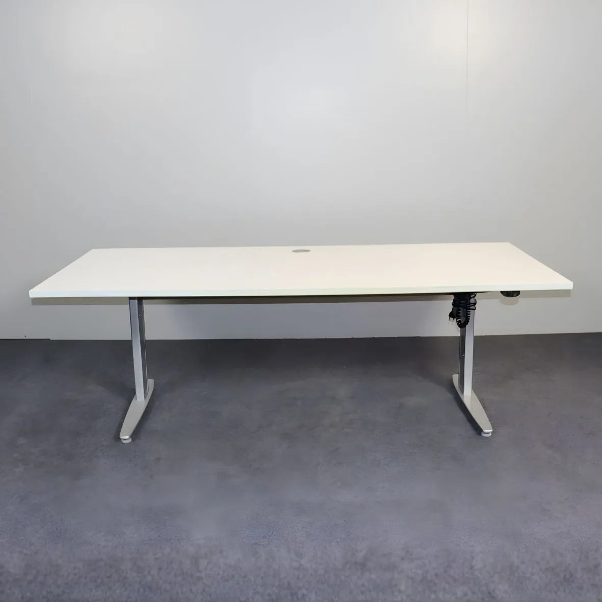 Sähköpöytä tuo mukavuutta ja liikkumisen vapautta työpäivään. Tämä käytetty sähköpöytä on varustettu luotettavalla moottoroidulla korkeudensäädöllä, joka mahdollistaa sujuvan siirtymisen istuma- ja seisomatyön välillä. Tyylikäs valkoinen kansi ja harmaat jalat tekevät siitä ajattoman valinnan jokaiseen toimitilaan.