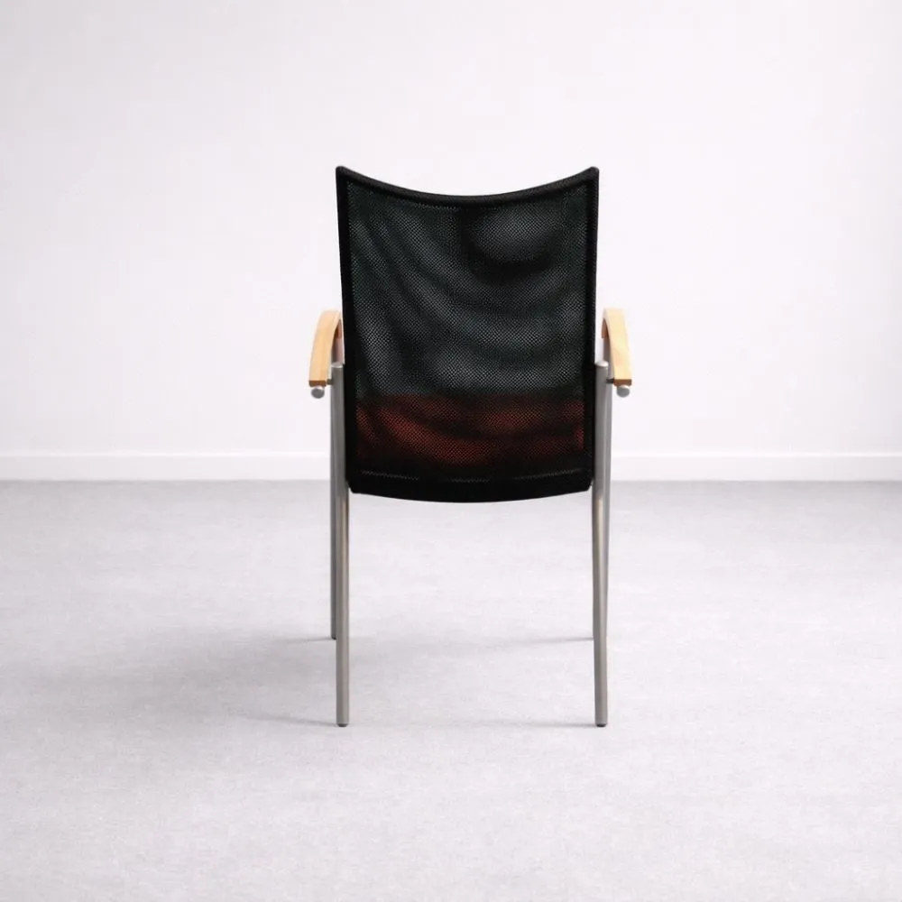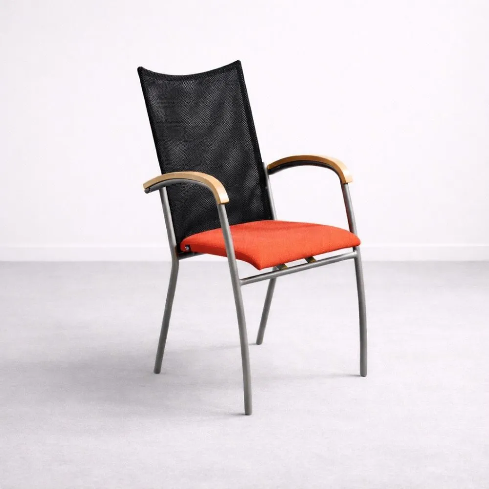 EFG tuoli istuinkorkeudella on selkeälinjainen ja mukava istuinratkaisu neuvottelu- ja vieraskäyttöön. Tämä käytetty EFG tuoli yhdistää hengittävän mustan selkänojan ja pehmustetun punaisen istuimen tarjoten miellyttävän istumakokemuksen ilman raskasta ilmettä.