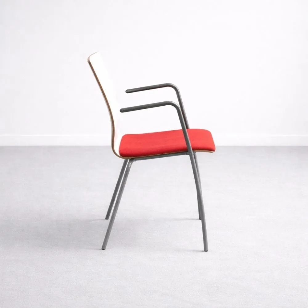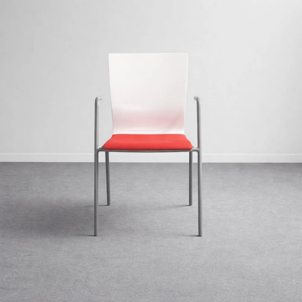 EFG tuoli on ajattoman selkeälinjainen istuin, joka sopii neuvottelutiloihin, taukotiloihin ja auloihin. Kevyt mutta tukeva rakenne tarjoaa miellyttävän istuinmukavuuden ilman raskasta ilmettä. Tämä käytetty EFG tuoli on siistikuntoinen, punaisella istuimella ja valkoisella selkänojalla. Harmaat metallijalat viimeistelevät hillityn ja ammattimaisen kokonaisuuden.